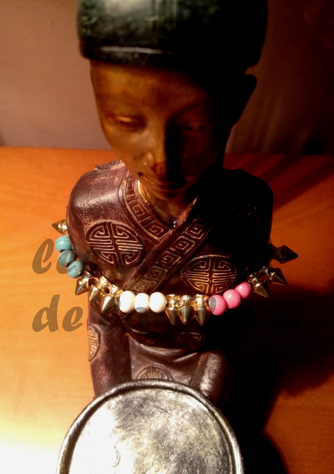 Pulsera realizada con pivotes de metal con baño dorado y bolas de cerámica mejicana con acabado envejecido en azul, rosa y beige.