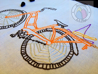 Bicicleta bordada sobre tela de lino en color gris perla, con diferentes tipos de bordado. Tamaño aprox. : 16 x 10 cm.