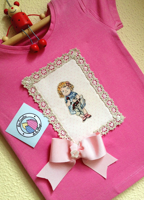 Camiseta para niña en color rosa fuerte, de manga corta y cuello redondo, con aplicación a festón de la muñeca "Sophie", enmarcada por una puntilla de lino en color natural.
